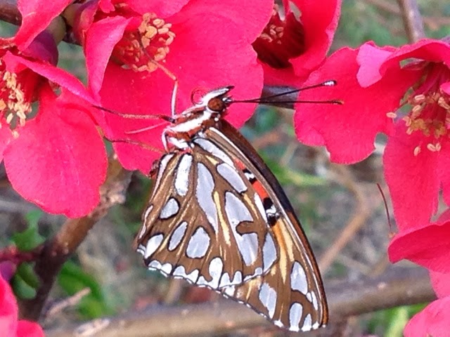 So, my Gulf Fritillary finally emerged. I think it has been several weeks. I had almost given up on it. I was quietly working on my computer when my cat started caterwalling. Not a regular meow like, "I want out," or "I want food." A weird long, loud MEEEEEOOOOOOOOOOOOOOOOOWWWWW! Hmm! What's that? Turns out she was telling me about the butterfly in the living room. So sweet! She didn't eat it! I took it outside and put it on the quince and got this pic. It is the end of January and I have several Gulf Fritillaries in my yard, and one Cabbage White.